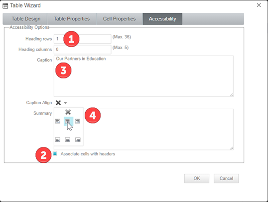 The Caption property (3) serves as the table title and using the Caption Align dropdown (4) lets you place the caption on the top, bottom, left, right or center of the table.