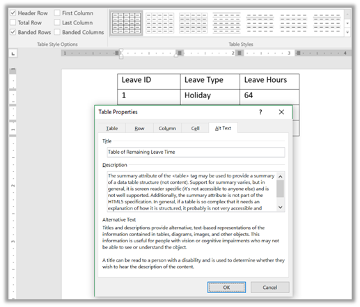 To summarize, creating an accessible table is partly a function of creating the correct table layout and partly a function of using the Table Wizard in SchoolMessenger’s editor. From within Microsoft Word, there is similar functionality by first creating a table layout. Then right-click in any cell and select table properties from the popup menu. Again, look for and open the Accessibility tab to access the properties.