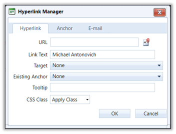 Creating or editing hyperlinks of any type typically involves opening the Hyperlink Manager dialog while editing the content in the Presence portal interface. Note that there are three types of hyperlinks. Each has a different purpose.