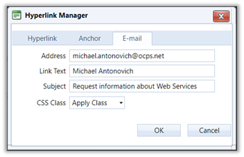 E-Mail – This tab allows you to create a link which when clicked opens the user’s email application. The properties included for e-mails include the Address of the person or group to which the email will be sent, the Link Text displayed on the page, and an optional Subject text. Note that the subject text can be beneficial to the person(s) receiving the email so the email can be classified and possibly routed to a separate folder. It also eliminates the need for the user to create a subject appropriate to the request. However, as you can see in the following figure, there is no property to define the tooltip text.
