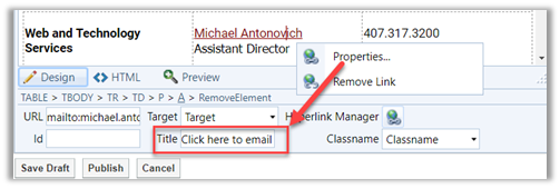 Then right click on the text of the e-mail hyperlink to select it and choose Properties from the dropdown menu that appears. This opens a properties panel at the bottom of the editor with several properties. The one that you need to update is the Title property entering the text that you want to appear as tooltip text as shown in the next figure.