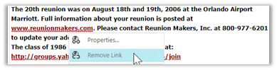 But this is awkward at best because even with the URL field blank, you cannot click OK without first providing a Tooltip! A more appropriate choice is to click anywhere within the link text and click the Remove Link button from the Edit toolbar. You can highlight the text first, but you do not have to.