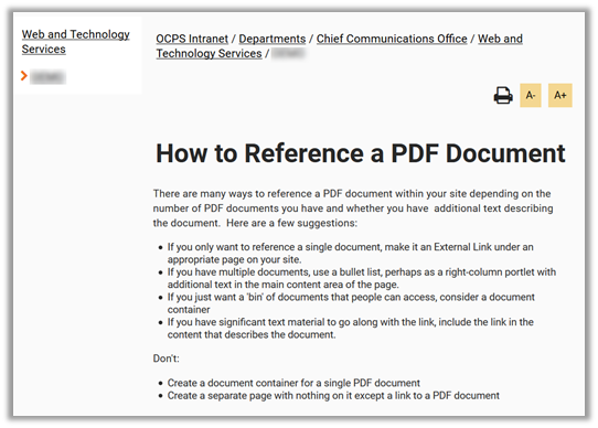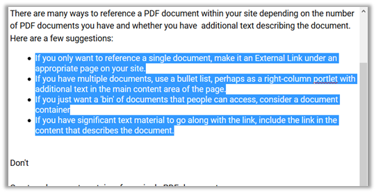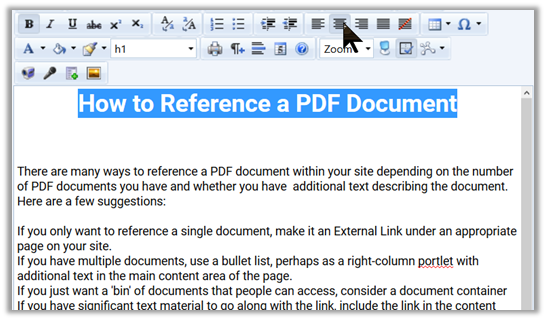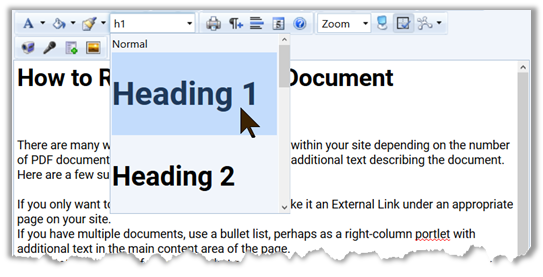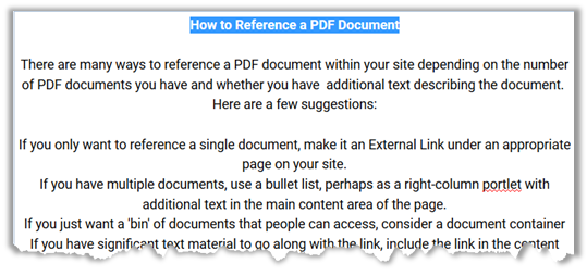 Additionally, you may notice that there is no option to change the font size of the header to make it stand out. We can solve both of these issues as well as help the vision impaired navigate a longer document by defining headers (sections of similar text) as shown below. NOTE: Headers are NEVER used merely to format the text, but because the line “How to Reference a PDF Document” is really a logical topic heading in the text. It is a side benefit that a heading in this case will also help format the text. NEVER use headers solely to format text. However if the text should be a header of a section, take the freebee of formatting the text while defining content sections within your page.