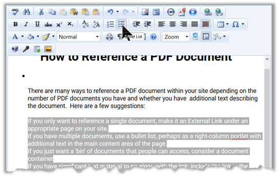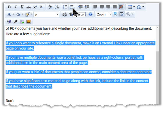 Let’s say you have a document with the following text in the main Page Content area (although this technique will work in any content portlet) which you first directly typed your text into the design area.