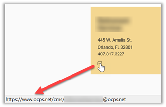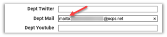 When you enter an email address on a web page, it is very important that the final address link on the page includes the prefix: mailto: before the email address. If it does not, the email address may be interpreted as a web page instead which of course will result in a ‘broken link’ and frustration for the end-user. An example of forgetting to include mailto: in the address occurs in your gold box department information. In the example below, the mail icon points to an address that begins with: https://www.ocps.net/cms/…