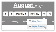 On the calendar, click on the plus sign (+). Note this opens a dropdown menu that lets you enter individual calendar events or import an event file.