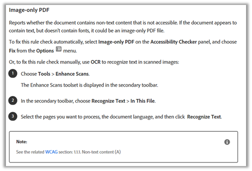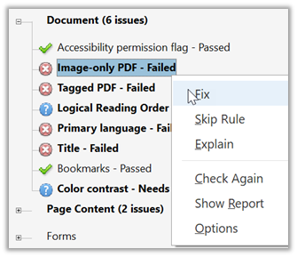 The first line tells us that a scanned image document is not accessible. However, there ‘may’ be a way to extract the text from the image and ‘fix’ the document to make it accessible by selecting the ‘Fix’ option. For simple documents, this may fix the problem. If not, you could also try a 3rd party OCR (Optical Character Reader) to convert the document. You could also try the steps listed in the Explain text to extract the text thus making the document readable.