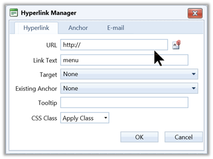 1. You could place a hyperlink inside your content on another page. When defining the hyperlink, you must copy the URL of the page you want to link to and directly paste it in the URL field. Do not use the button to the right of the box. This will take you to the Document Manager, really the File Manager for files associated with your site like PDF files. Also as this is a link to another page within you site, make sure the Target is None. Finally, you must supply a Tooltip text string that tells the user what the link is about to do.