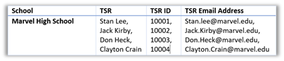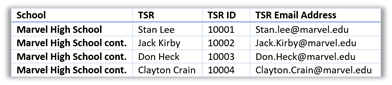 Maintaining a simple table structure means that you should not use split or merged cells. Screen readers read from left to right, top to bottom. Merged or split cells could be confusing when read by a screen reader as it either jumps over a cell or reads only the cell contents midway across a row without including the context of where it is in the table. Merged and split cells are typically the result of merging or splitting cells vertically. (There are times when you need to split or merge cells horizontally too.) Fixing vertically merged cells may be as simple as not merging the cells in the first place and placing the same text in each of the additional rows of that column with text that adds the word: Cont. to the end of the text. In the following figure, there is a school with four TSR’s. Rather than merging the common cells, you might do something like the following since all of the column data is unique except for the school name.