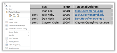 Tables have long been a popular way of displaying related information that would be difficult to read if you provided the same information in paragraph form. Tables imply a structure to the data and thus are visual. Each row of the table represents an instance of whatever you are listing in the table while each column represents a common attribute for each of the rows. For example, a table might represent all of the TSRs in the district. Each row of the table represents one of the TSRs. The columns then represent attributes that describe more information about the TSR such as their name, school, employee ID, email address, and more.