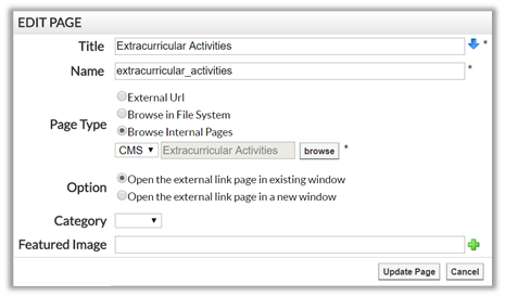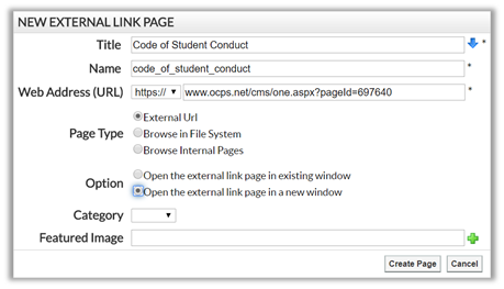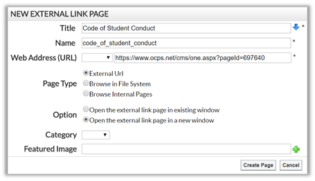 But even if you choose to only link to the district page, there is no need for a separate content page on the school site to do this. Rather than create a content page and place a single link on it to the district page, use an External Link Page to directly point to the district page right from the site navigation menus. Simply go to the parent page (such as School Information, or perhaps Policies under Student) and add an External Link Page with the following details: