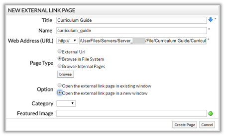 Another thing we have seen as we look through the both the district and school pages is the use a content page in which the content is nothing more than a link to another page either within OCPS but more often external to OCPS. One of several similar situations I saw through all the sites I looked at was a page named Curriculum Guide which had nothing more than a link on the page to the curriculum guide which happened to be a PDF files stored in the site’s File Manager. In this case, it would have been better to create an external link page under the parent page that pointed to the PDF directly as shown in the following figure.